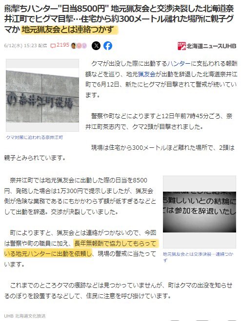 | 熊撃ちハンター"日当8500円" 地元猟友会と交渉決裂した北海道奈井江町でヒグマ目撃…住宅から約300メートル離れた ... - Yahoo!ニュース 熊撃ちハンター"日当8500円" 地元猟友会と交渉決裂した北海道奈井江町でヒグマ目撃…住宅から約300メートル離れた ... Yahoo!ニュース (出典:Yahoo!ニュース) |