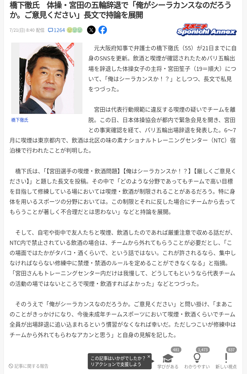 擁護オヂ代表、橋下徹さんナショナルトレーニングセンターでの飲酒発覚で擁護を諦めてしまう